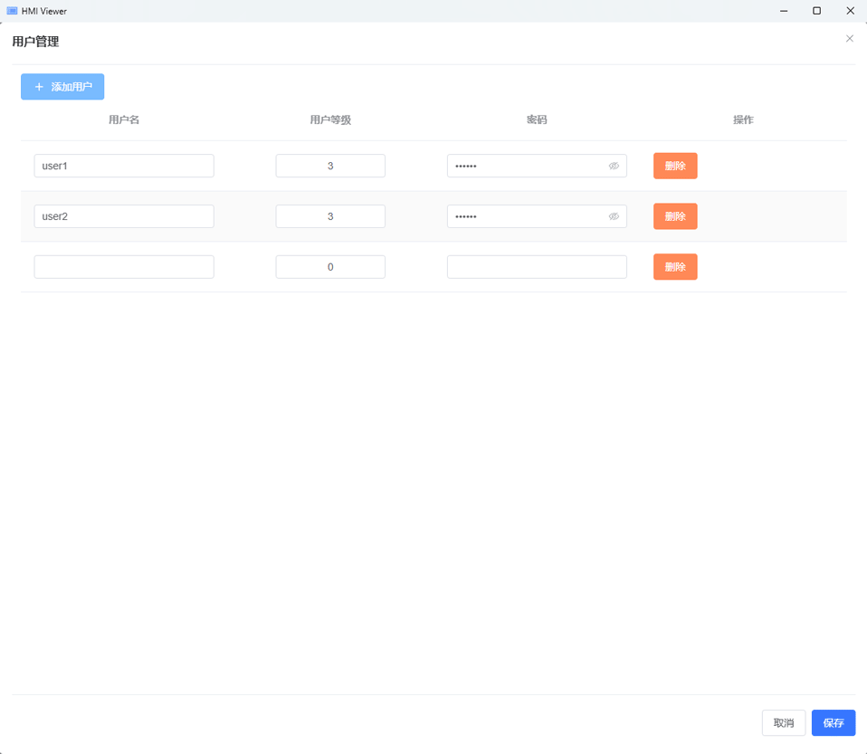 低代码人机交互组态软件HMI应用发布和使用用户登录和管理本页总览用户登录和管理HMI浏览器集成用户登录与分级权限管理功能,通过预设操作权限等级实现工业应用的安全管控,同时简化权限配置流程。 用户管理 使用 超级管理员 登录后,工具栏中会出现 用户管理 按钮,点击后可以进行用户管理。 点击 添加用户 输入 用户名、用户等级和密码,点击 确定 即可完成用户创建和编辑。